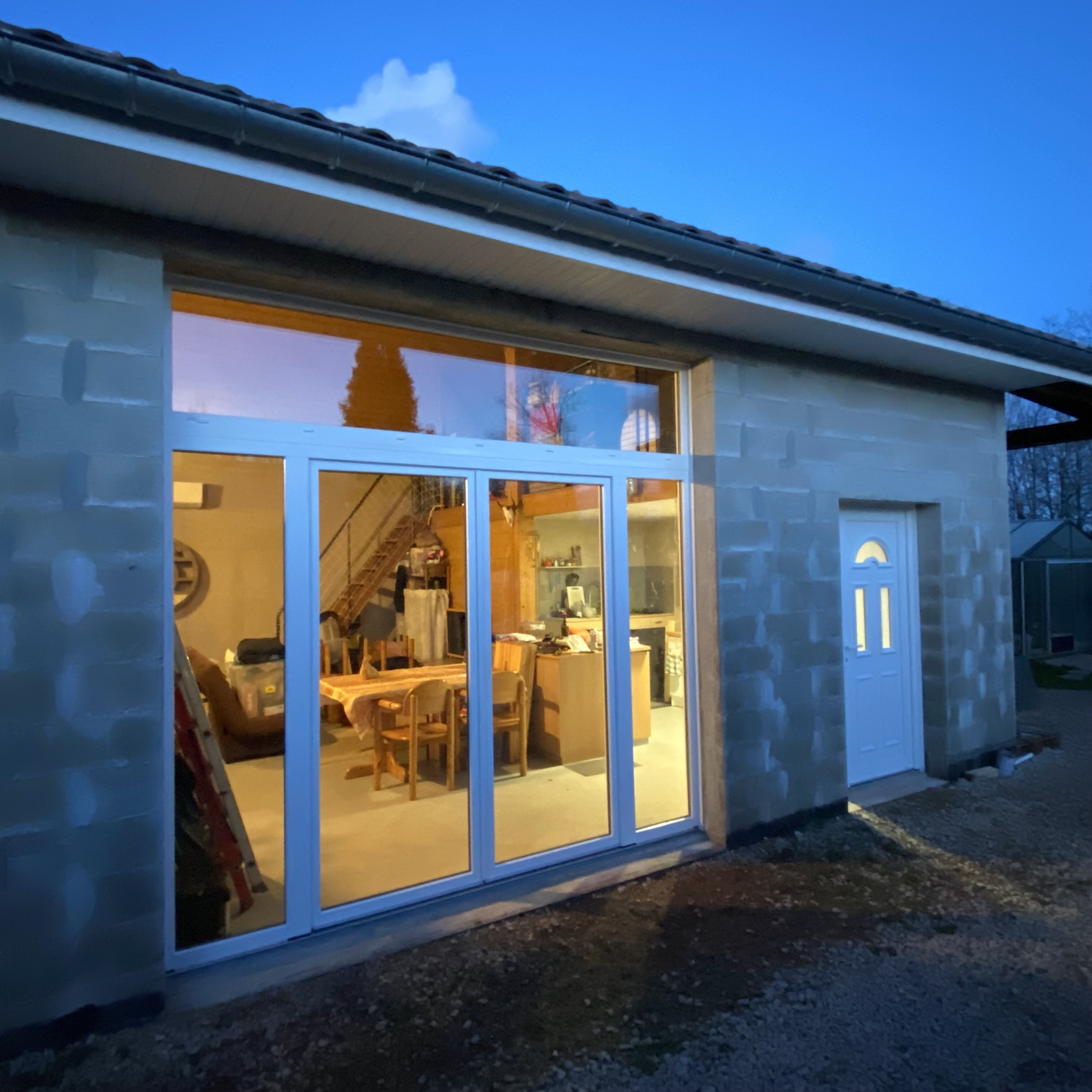 Réalisation d'un chantier de couleur Winchester, avec fabrication d'une porte d'entrée hors catalogue pour garder le style ancien.